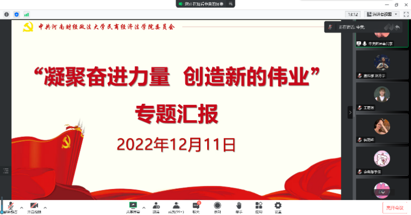 为提高入党申请人的理论水平和政治素养,学习贯彻党的二十大精神,12月11日,学院以线上会议的形式开展主题为“凝聚奋进力量,创造新的伟业”的入党申请人专题汇报会。学院第十三期全体入党申请人参加会议。