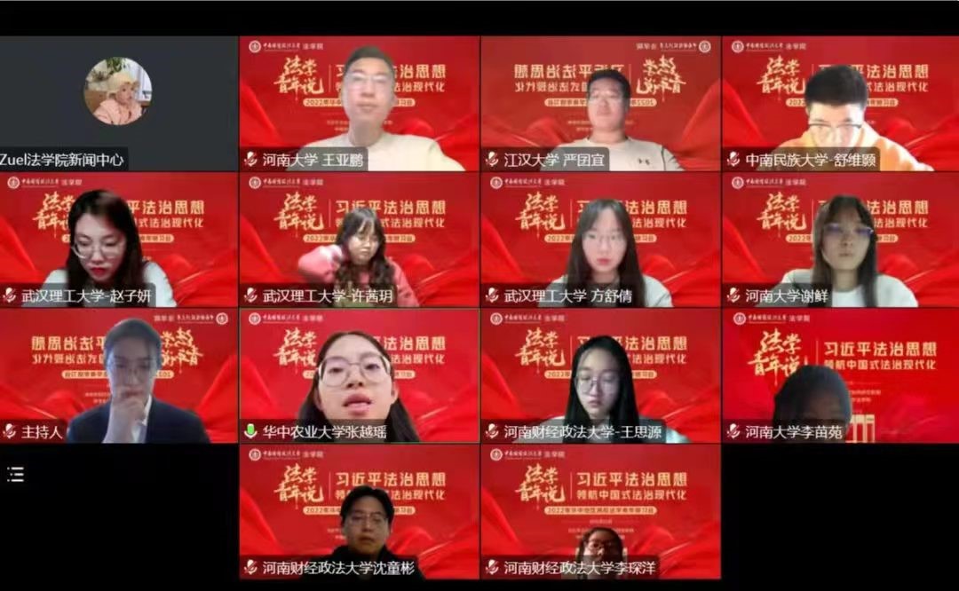 为深入学习宣传贯彻党的二十大精神,积极引导法科学子传承中华优秀传统法律文化、树立新时代法治理念,11月24日,由中南财经政法大学法学院主办的“2022年华中地区高校法学青年研习会”以线上会议的形式举行。学院本科生代表王思源、沈童彬和李琛洋参加会议。