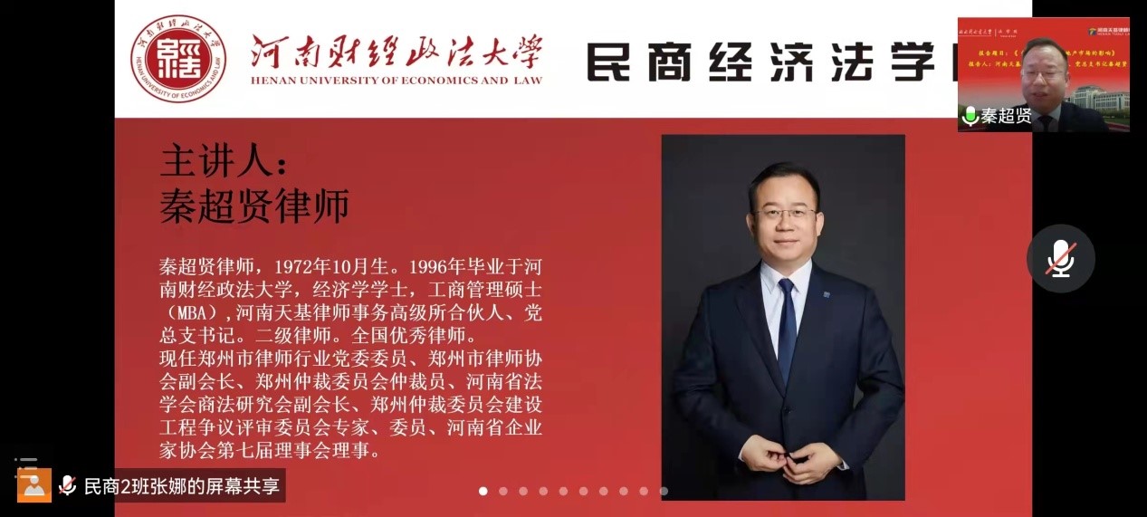 为有效提升学院毕业生求职应聘的核心竞争力,学院于3月28日以线上会议的形式开展“目标决定未来”为题的求职应聘专题云指导活动。活动邀请郑州市律师协会副会长、河南天基律师事务所高级合伙人、我校校友秦超贤律师为主讲人。会议由学院副院长张良主持。学院2018级毕业生参加活动。