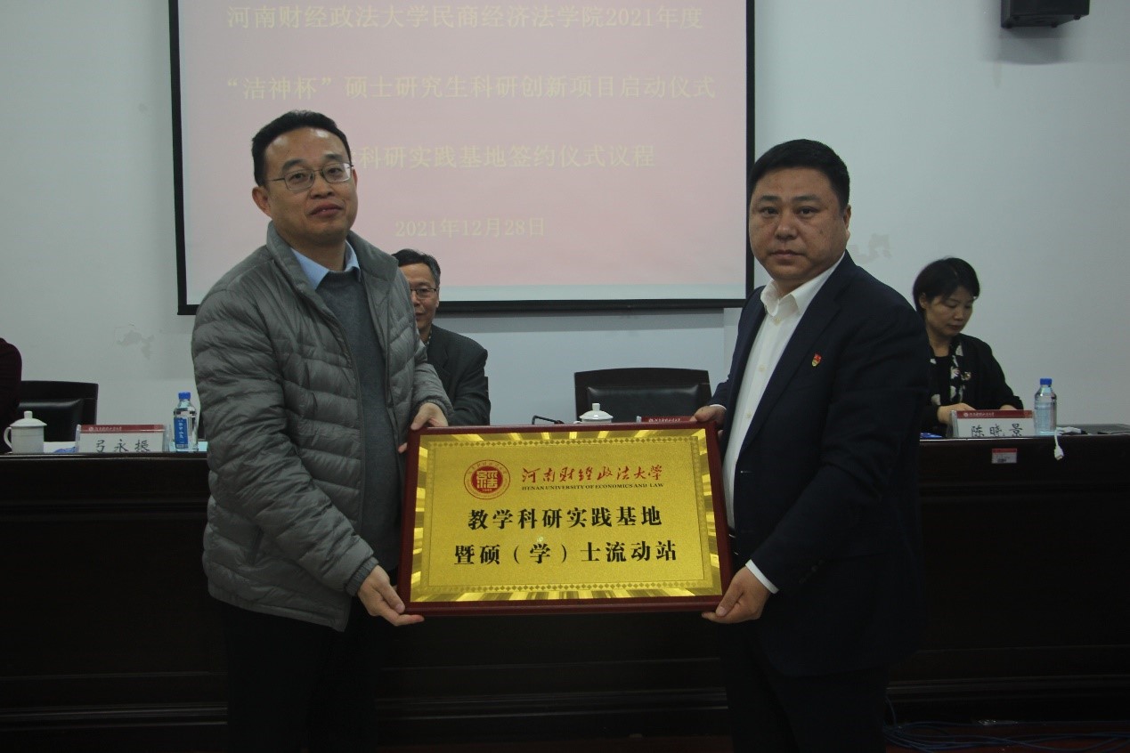 12月28日上午,2021年度“洁神杯”硕士研究生科研创新项目启动仪式暨教学科研实践基地签约仪式在学院209会议室举行。副校长赵传海、学院党委书记弓永振、院长陈晓景及班子其他成员,郑州洁神环境保护信息咨询有限公司董事长孙海鹏,全体硕士研究生参加活动。仪式由学院副院长张洋主持。