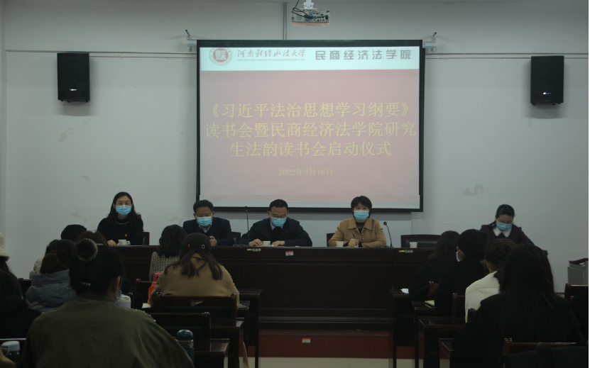 3月18日《习近平法治思想学习纲要》读书会暨民商经济法学院研究生法韵读书会启动仪式在学院209会议室举行。学院党委书记弓永振、院长陈晓景、党委副书记时从庚、副院长李嵩誉、张洋,研究生教学秘书杜晓丽、辅导员张严及学院全体研究生参加会议。会议由张洋主持。